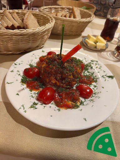 Śledź holenderski, pieczona papryka, ogórek kiszony, jabłko, kapary, miód, pomidory